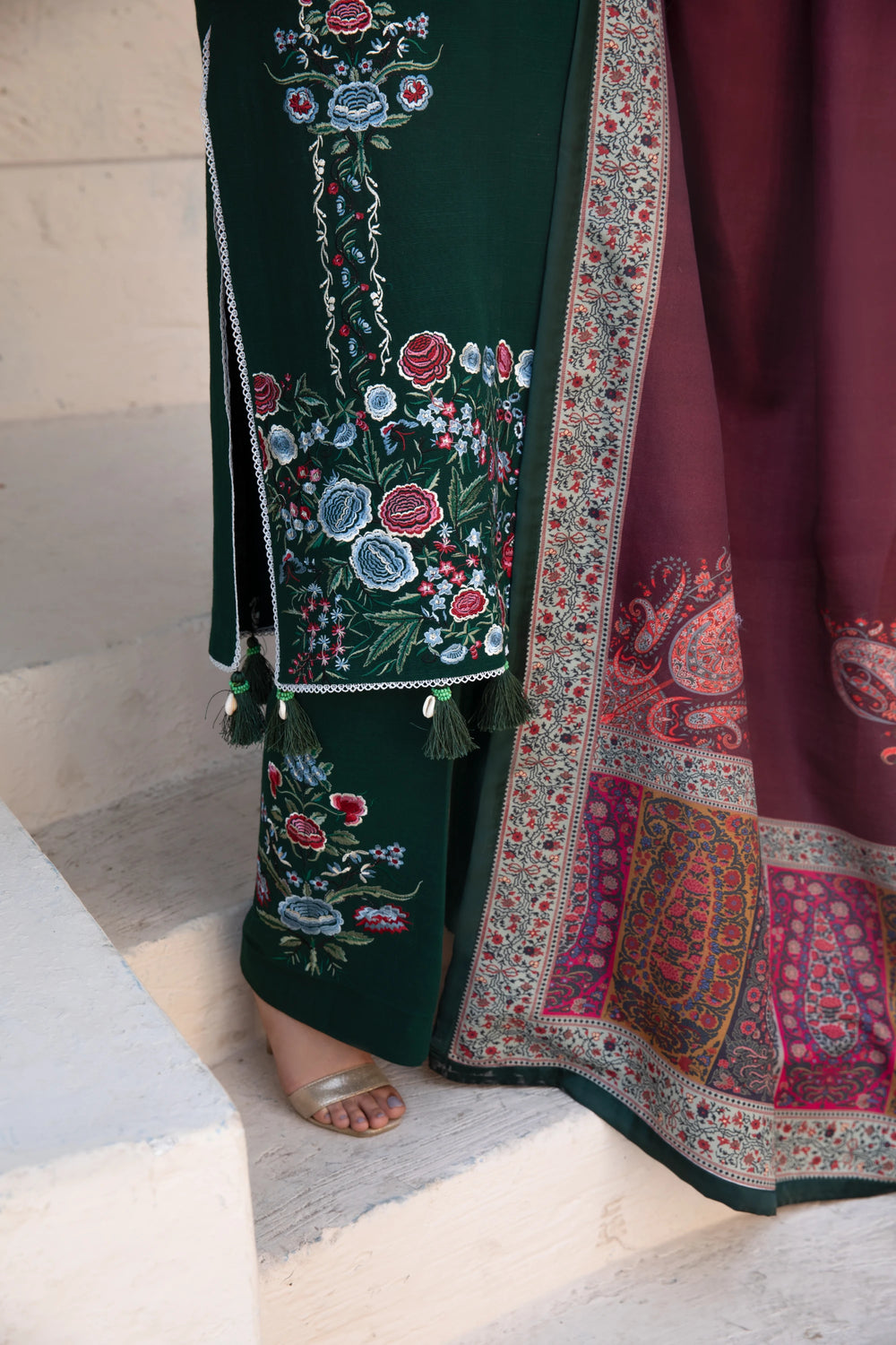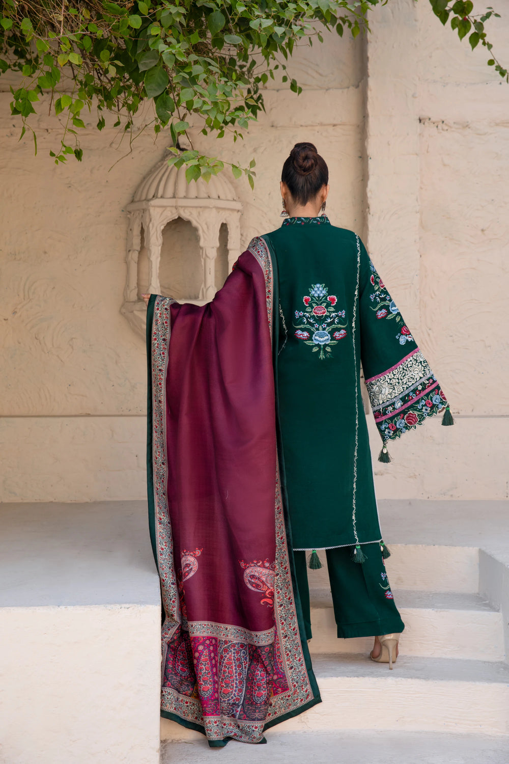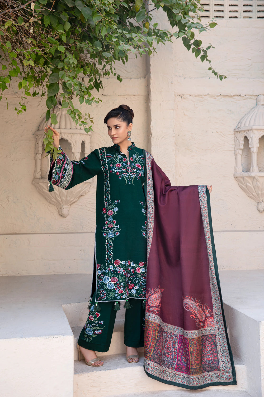A rich green khaddar ensemble tailored for winter sophistication. The stitched shirt and trousers offer a flattering structure, while the wool shawl enhances the outfit with warmth and depth. A perfect choice for daytime gatherings and seasonal wear.