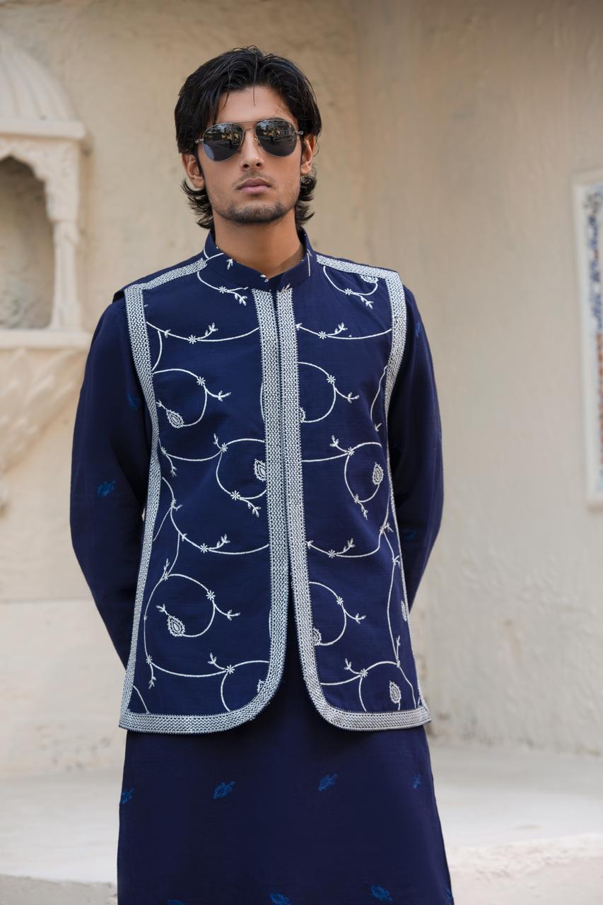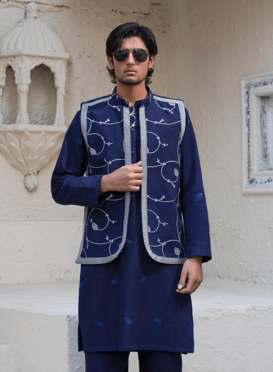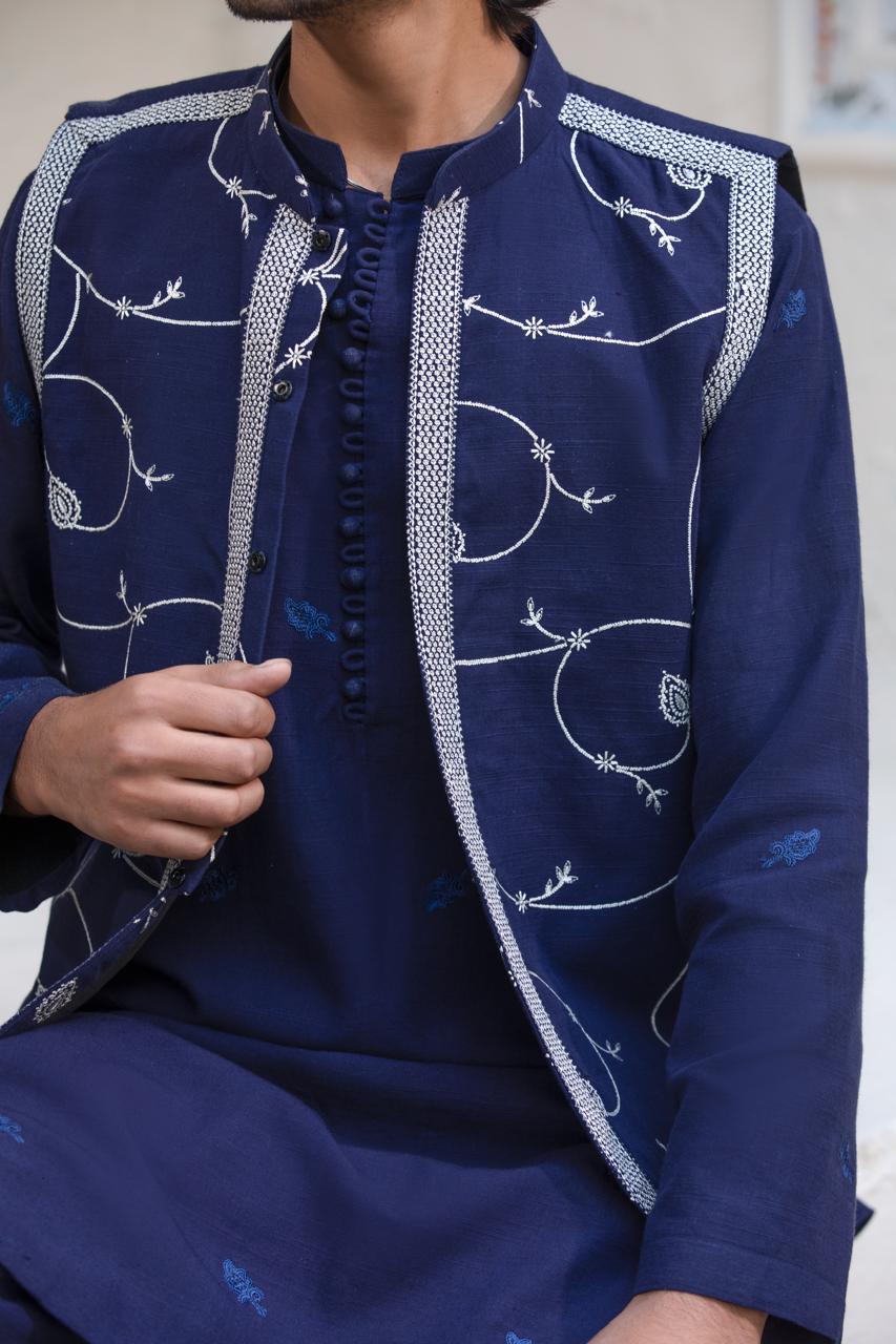 Tailored in deep navy blue khaddar, this embroidered waistcoat offers a refined and polished appearance. The detailed embroidery adds richness without overpowering the look, making it a versatile choice for formal winter styling.