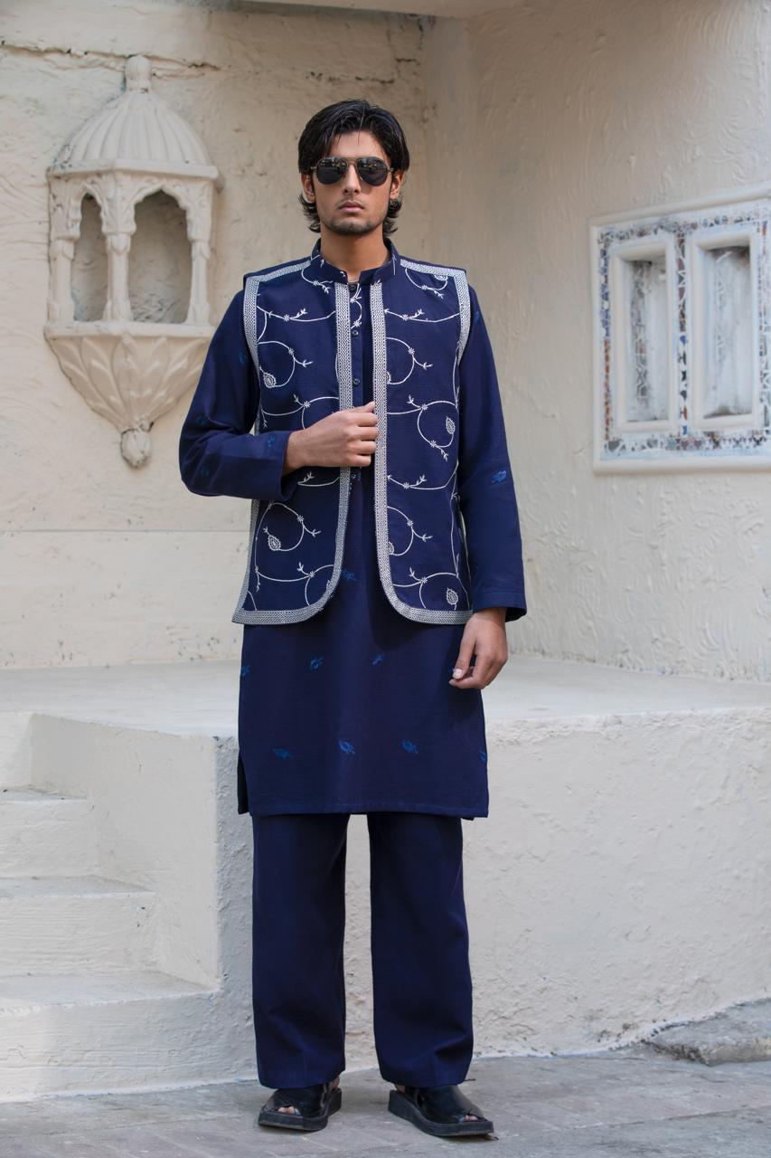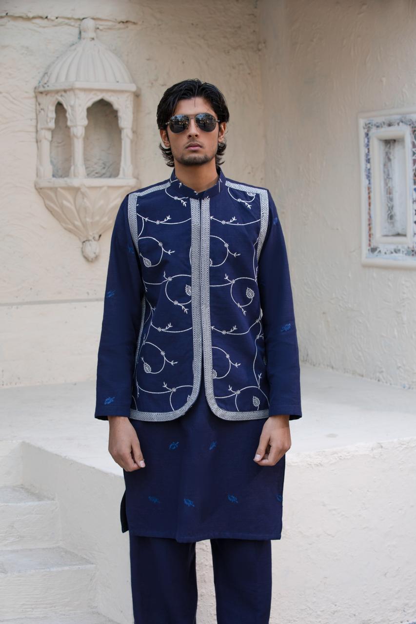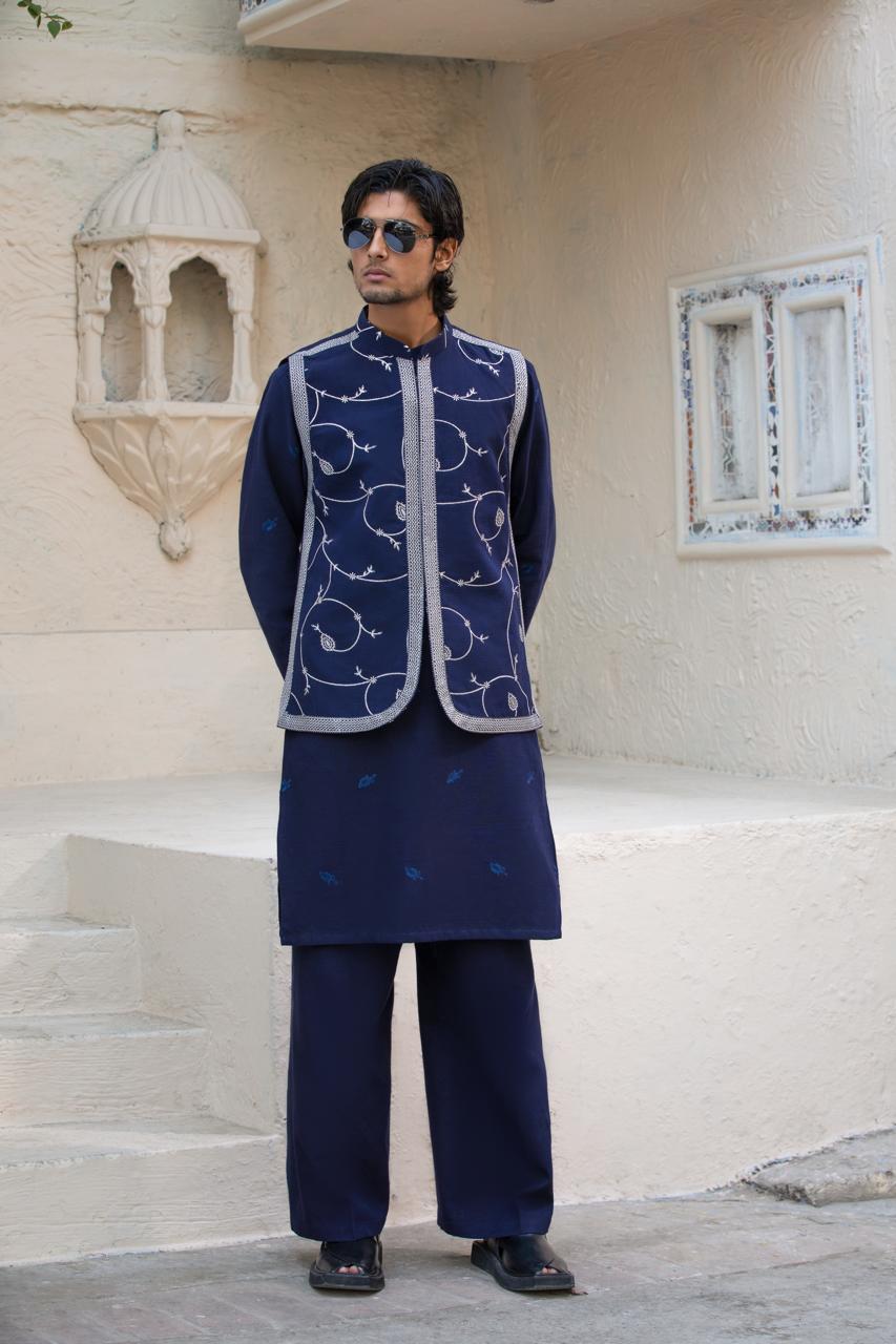 Tailored in deep navy blue khaddar, this embroidered waistcoat offers a refined and polished appearance. The detailed embroidery adds richness without overpowering the look, making it a versatile choice for formal winter styling.