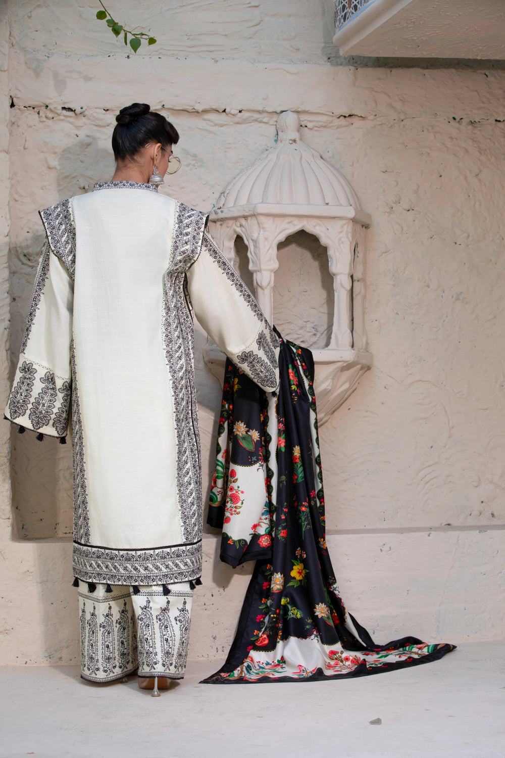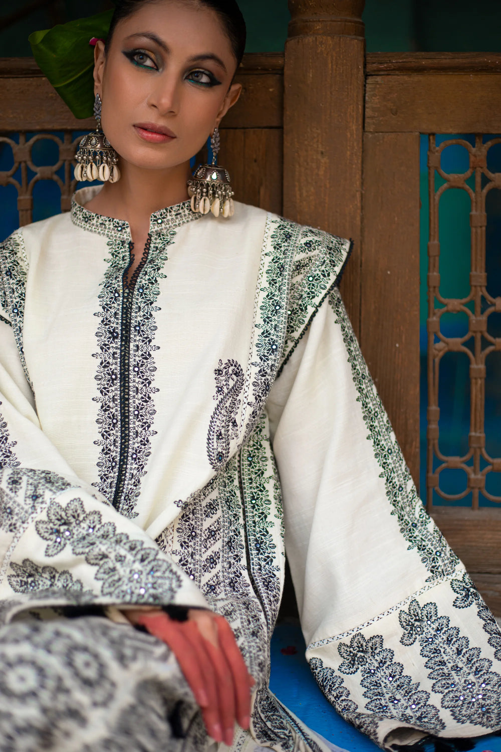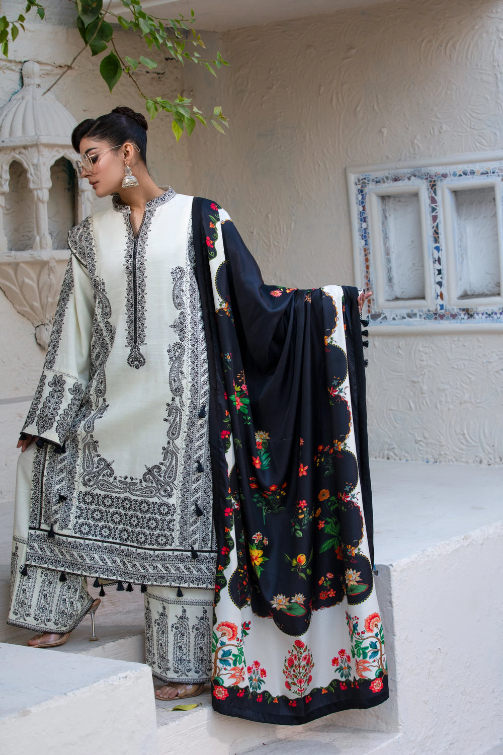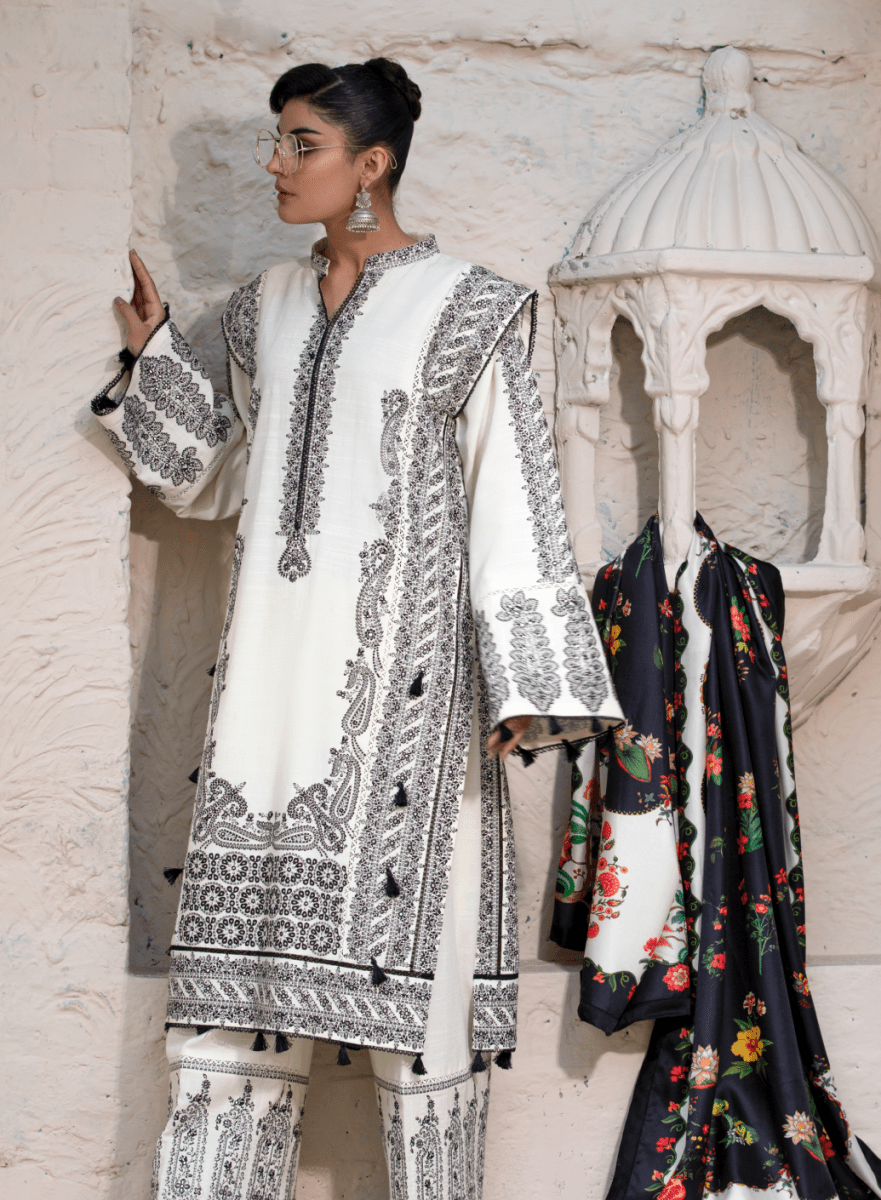 This ivory stitched three-piece suit reflects understated luxury. The breathable khaddar shirt and trousers are paired with a soft wool shawl, creating a refined winter look that balances comfort with elegance. Ideal for minimal yet graceful styling.