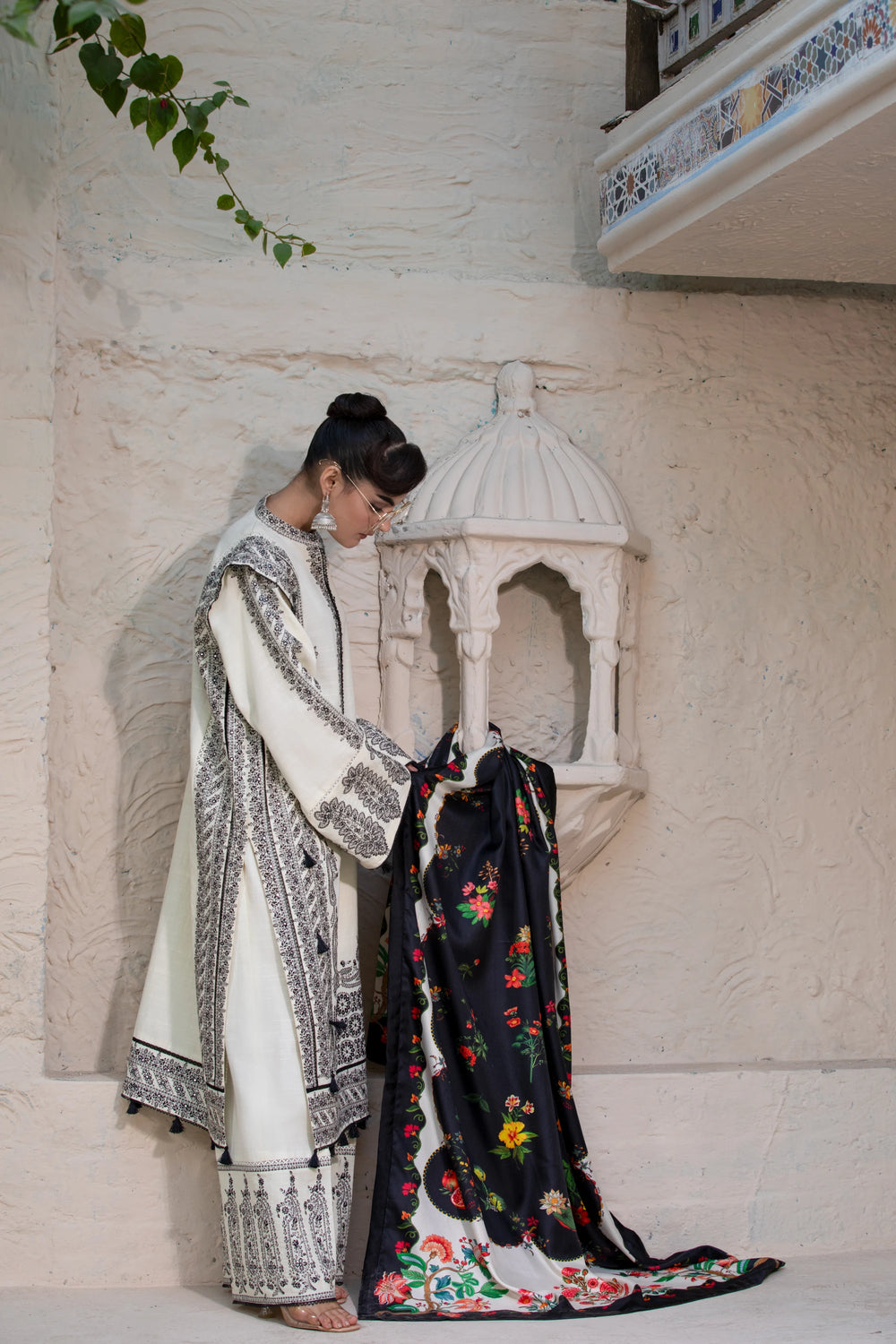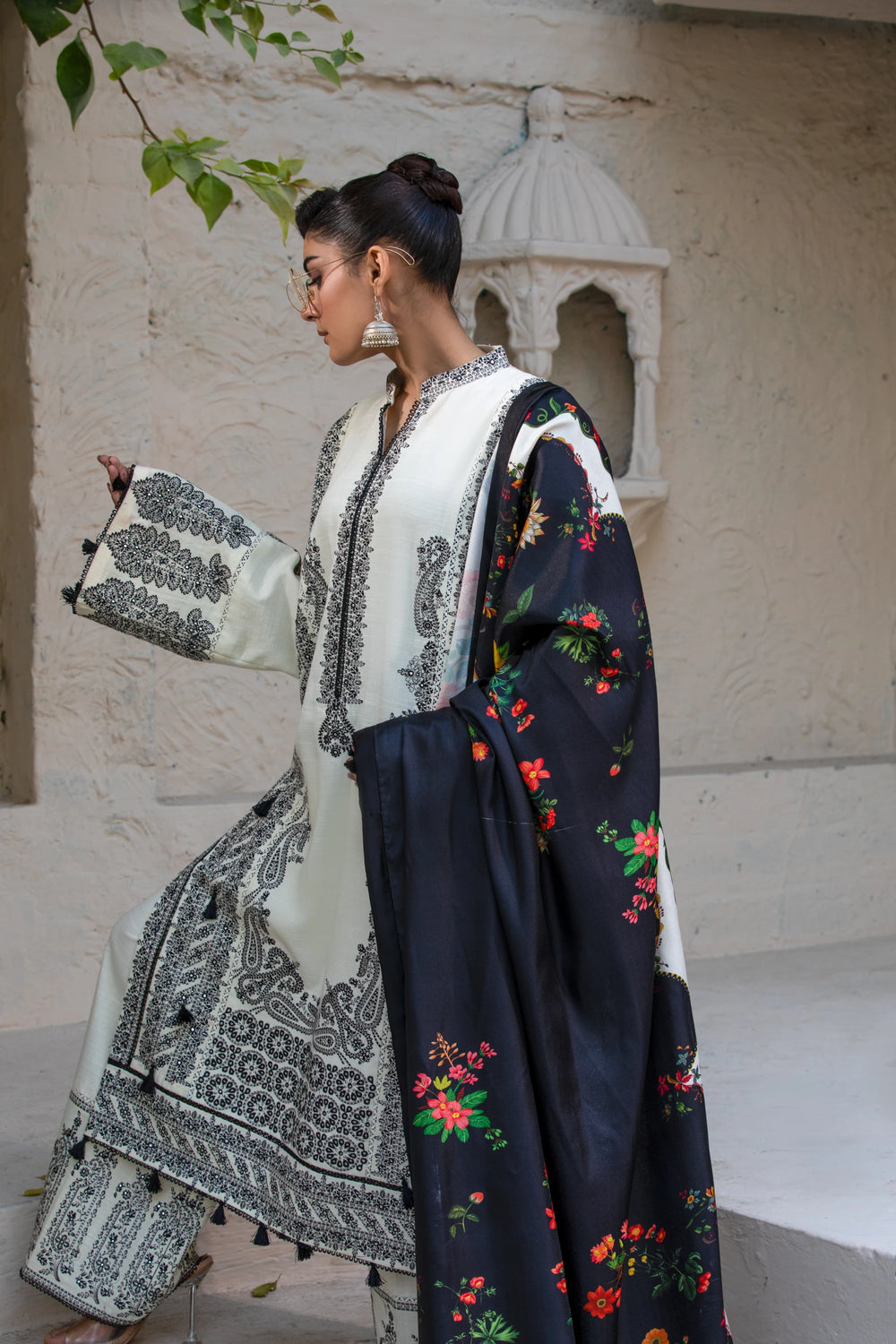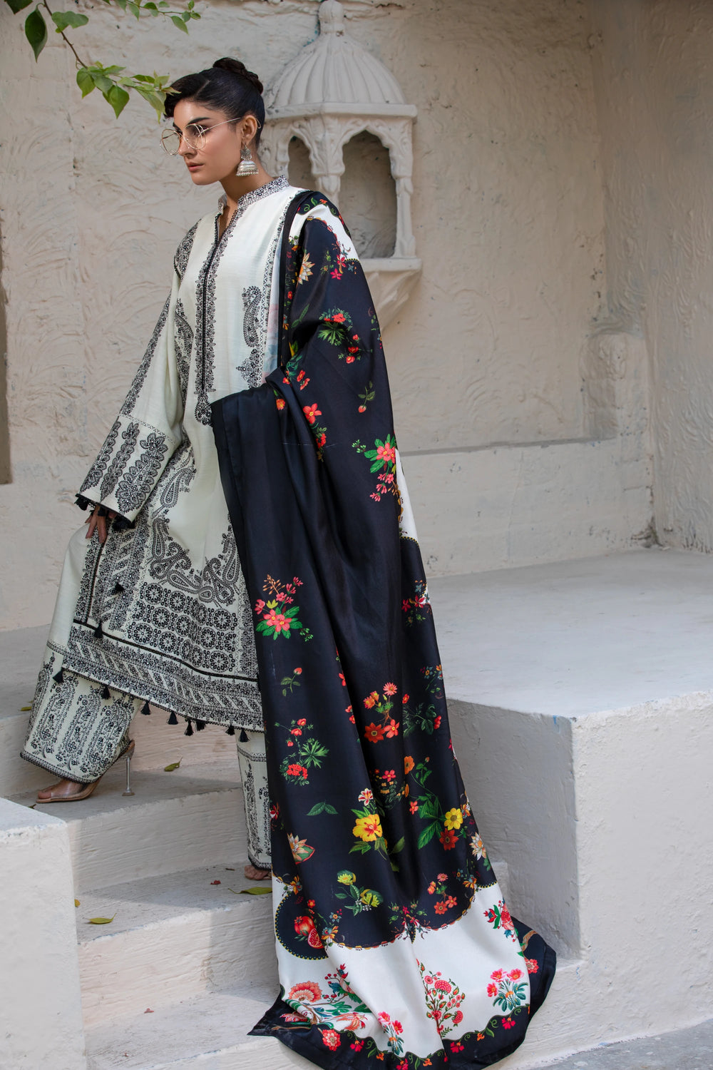 This ivory stitched three-piece suit reflects understated luxury. The breathable khaddar shirt and trousers are paired with a soft wool shawl, creating a refined winter look that balances comfort with elegance. Ideal for minimal yet graceful styling.