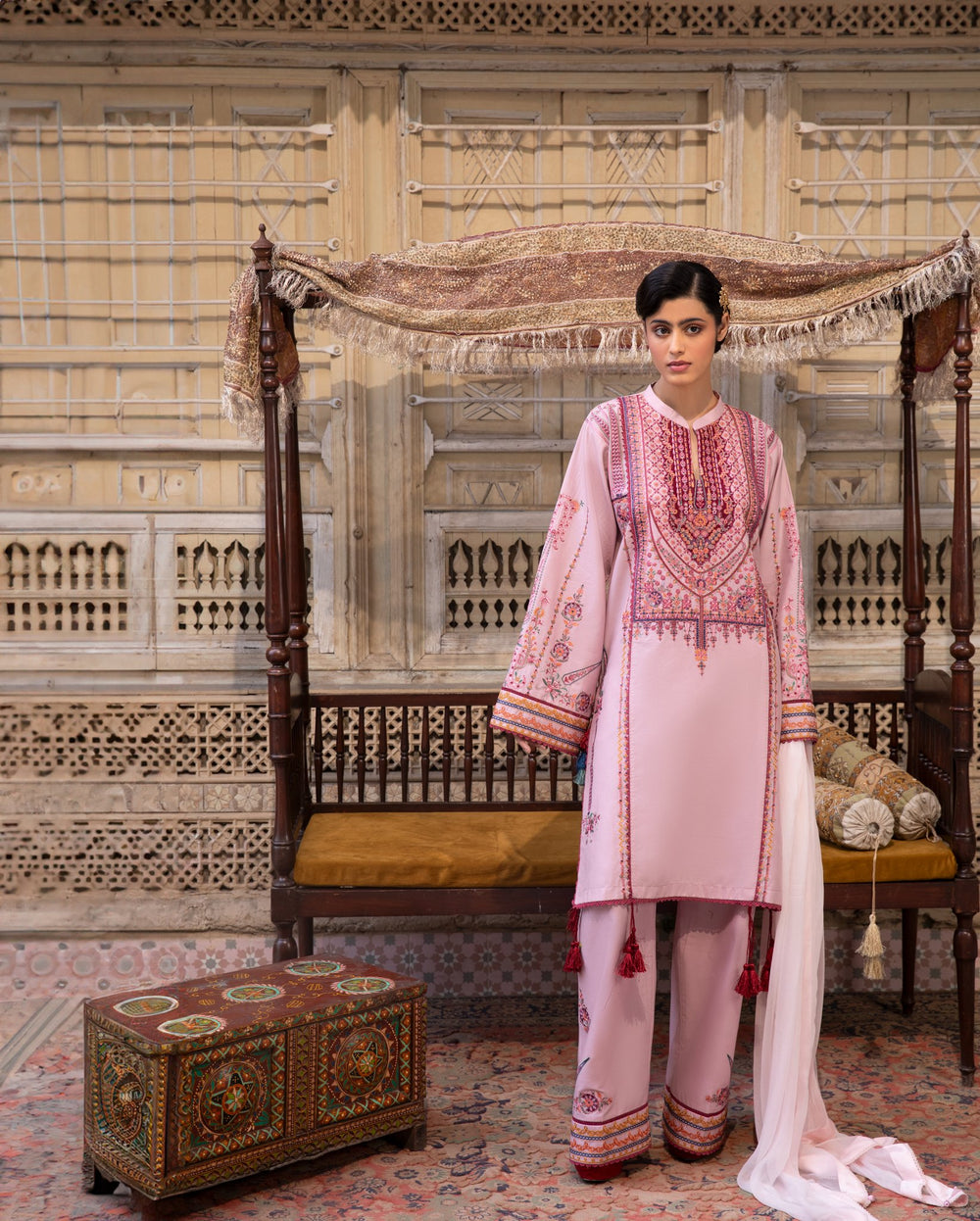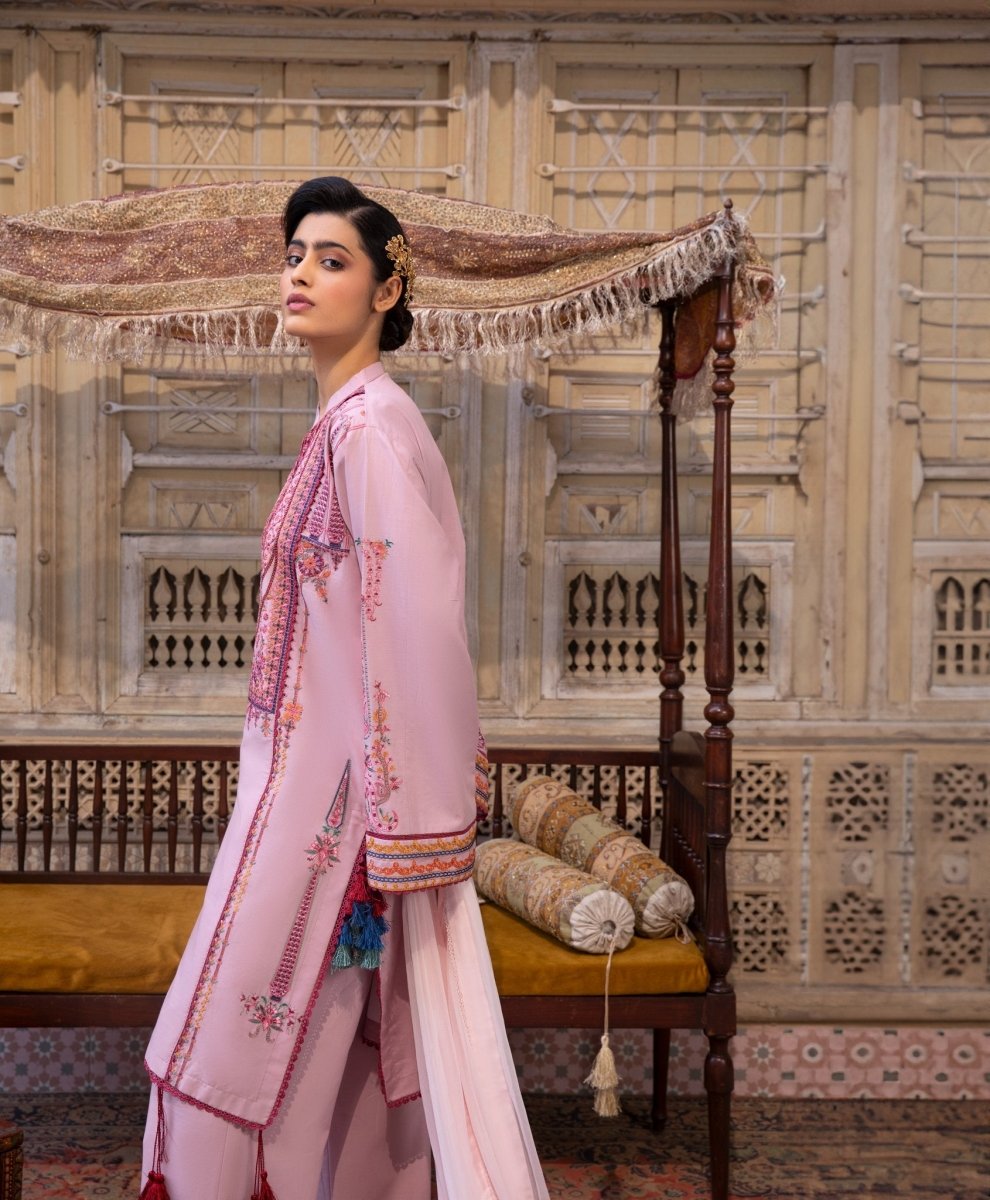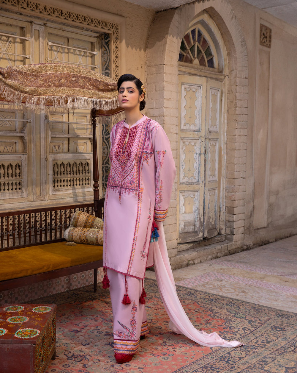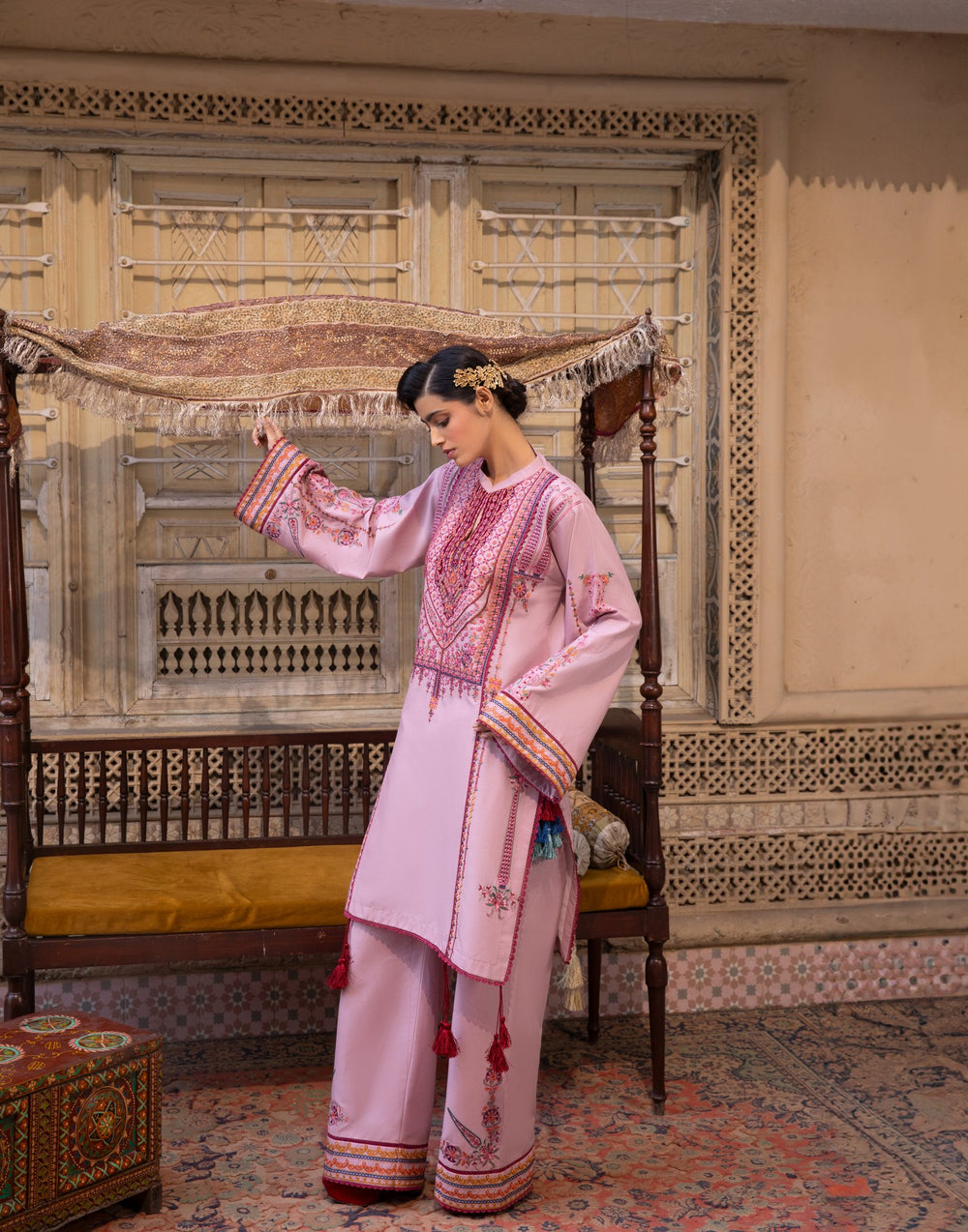 Embrace bold elegance with this deep crimson ensemble, featuring intricate ethnic patterns and a contemporary silhouette.