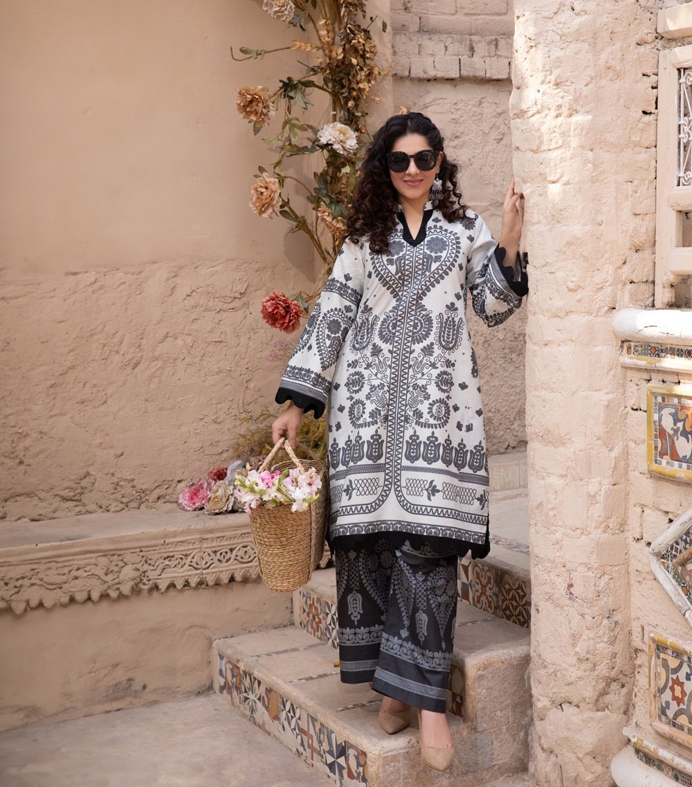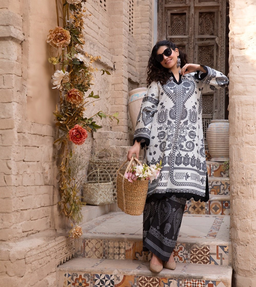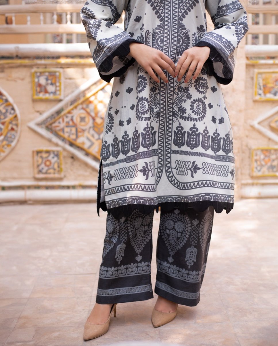 Step into timeless sophistication with our Charcoal & Ivory printed set. Made from high-quality, breathable lawn, this ensemble features bold, ethnic-inspired patterns and a chic scalloped hem for a refined summer look.