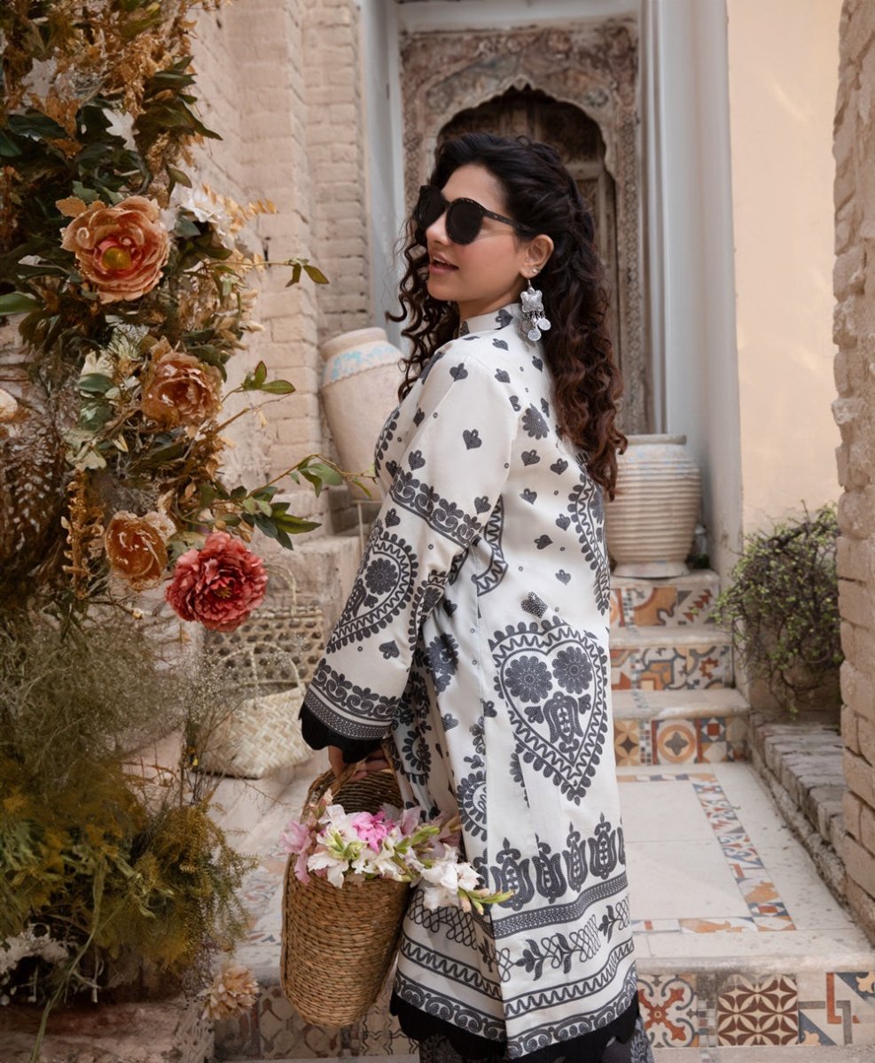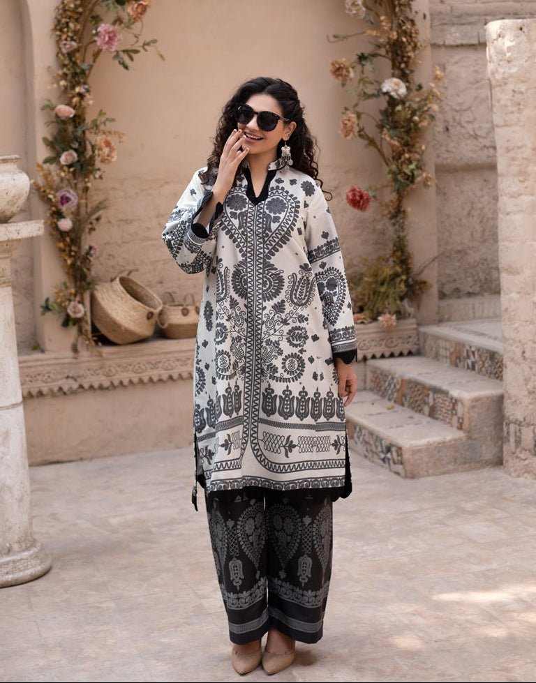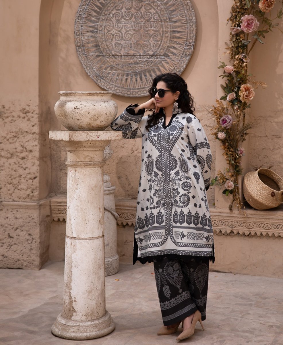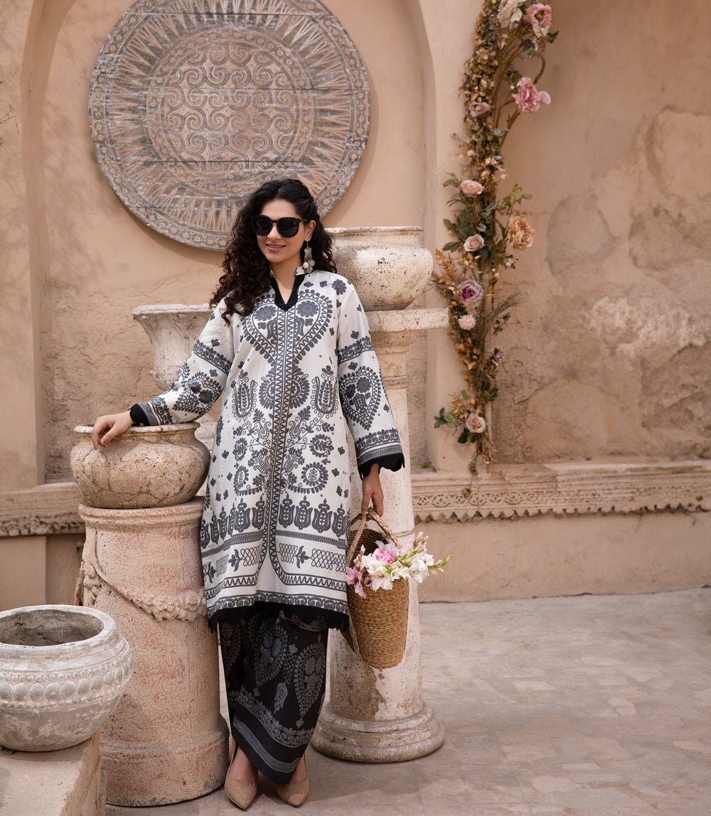 Step into timeless sophistication with our Charcoal & Ivory printed set. Made from high-quality, breathable lawn, this ensemble features bold, ethnic-inspired patterns and a chic scalloped hem for a refined summer look.