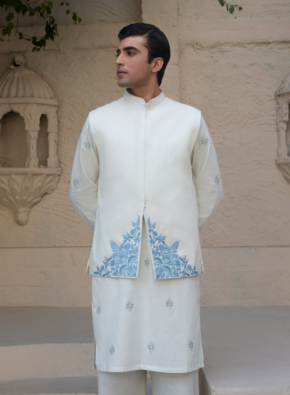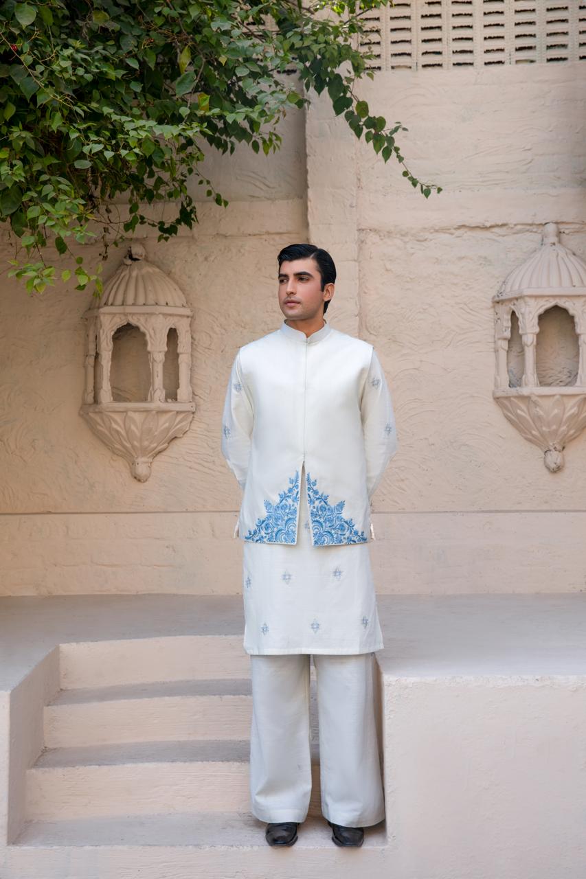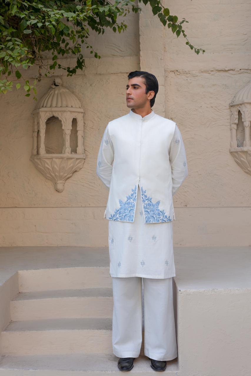 Minimal yet striking, this white khaddar waistcoat exudes sophistication. The fine embroidery enhances its clean aesthetic, making it an ideal layering piece for formal and religious occasions. Designed to elevate traditional outfits with subtle elegance.
